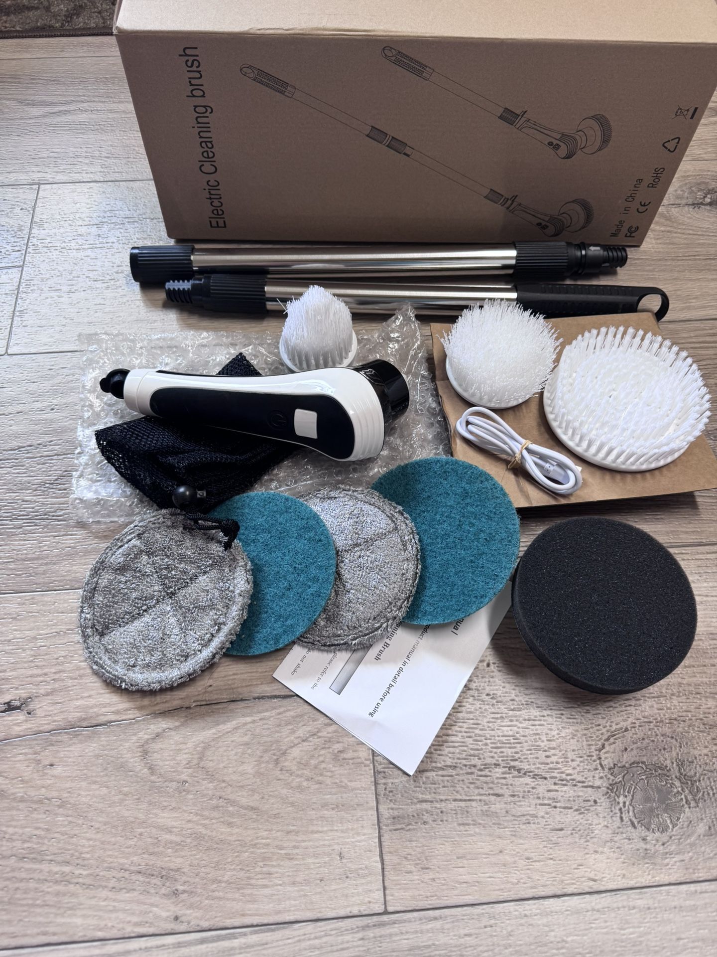 Material Stainless Steel ❤️ Cordless ❤️ Power Display Screen ❤️ Waterproof ❤️ 8 Replaceable Brush Heads ❤️ Adjustable & Detachable Handle , Maximum Length 51 inches ❤️ 2 Adjustable Speeds