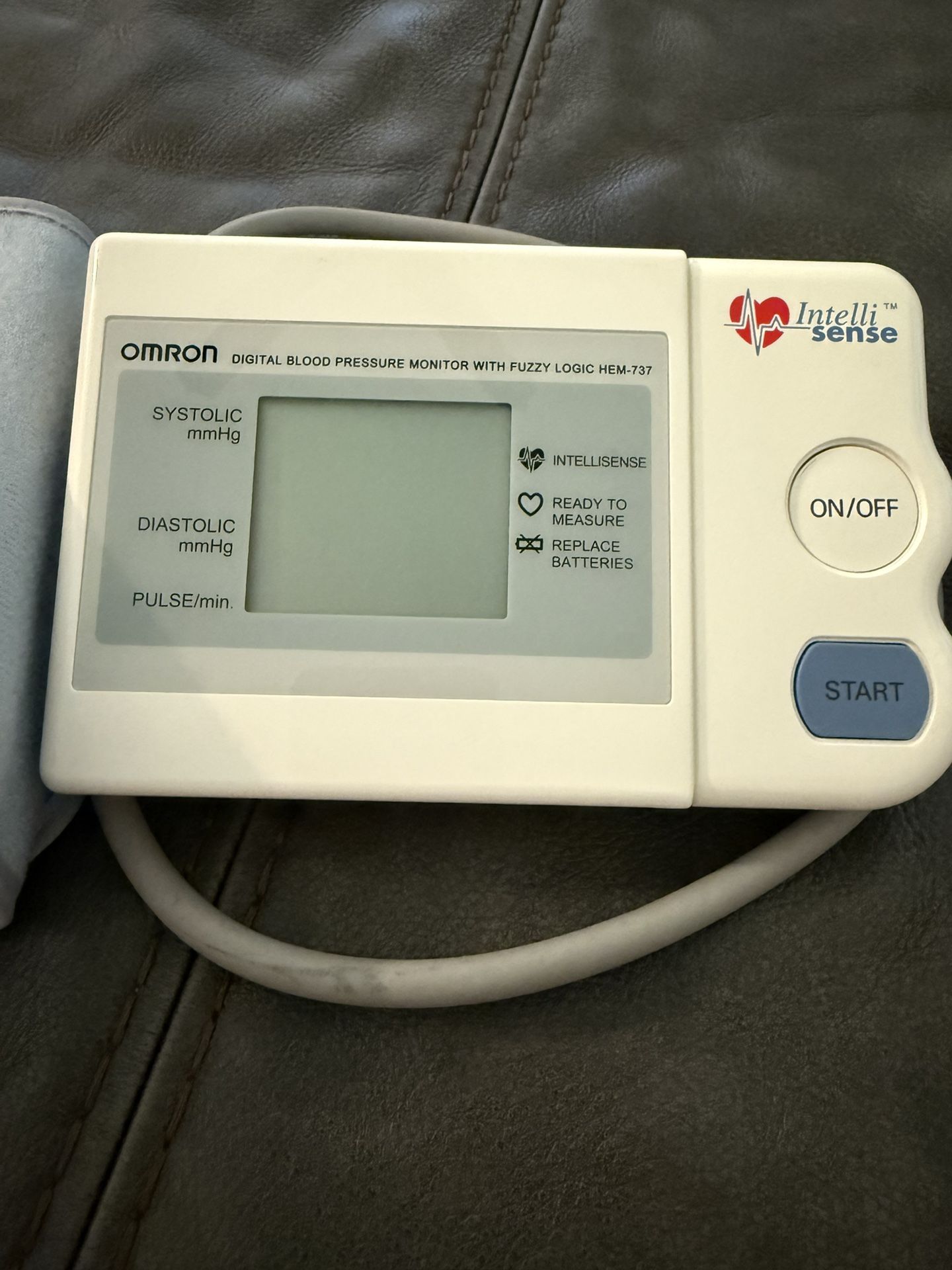 Selling an Omron blood pressure machine with Intellisense. Model: HEM-737. Automatically takes blood pressure with the press of a button. Comes with arm cuff, manual, power cable, and original box! Can be used with batteries so you don’t have to plug it in every time. Have some peace of mind at home! Cash/Venmo/Apple pay only, no trades. Call or text anytime!