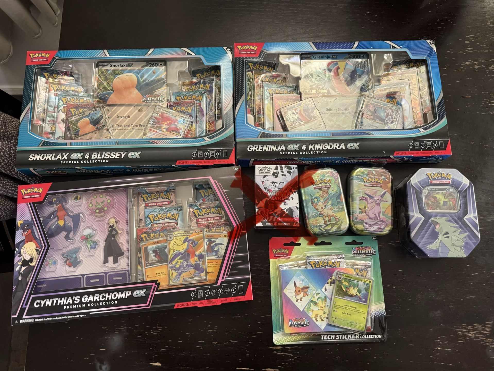 EX boxes $55 Cynthia’s garchomp $55 Tyranitar tin $35 Prismatic $45 Tech sticker pack and 30 for each tin