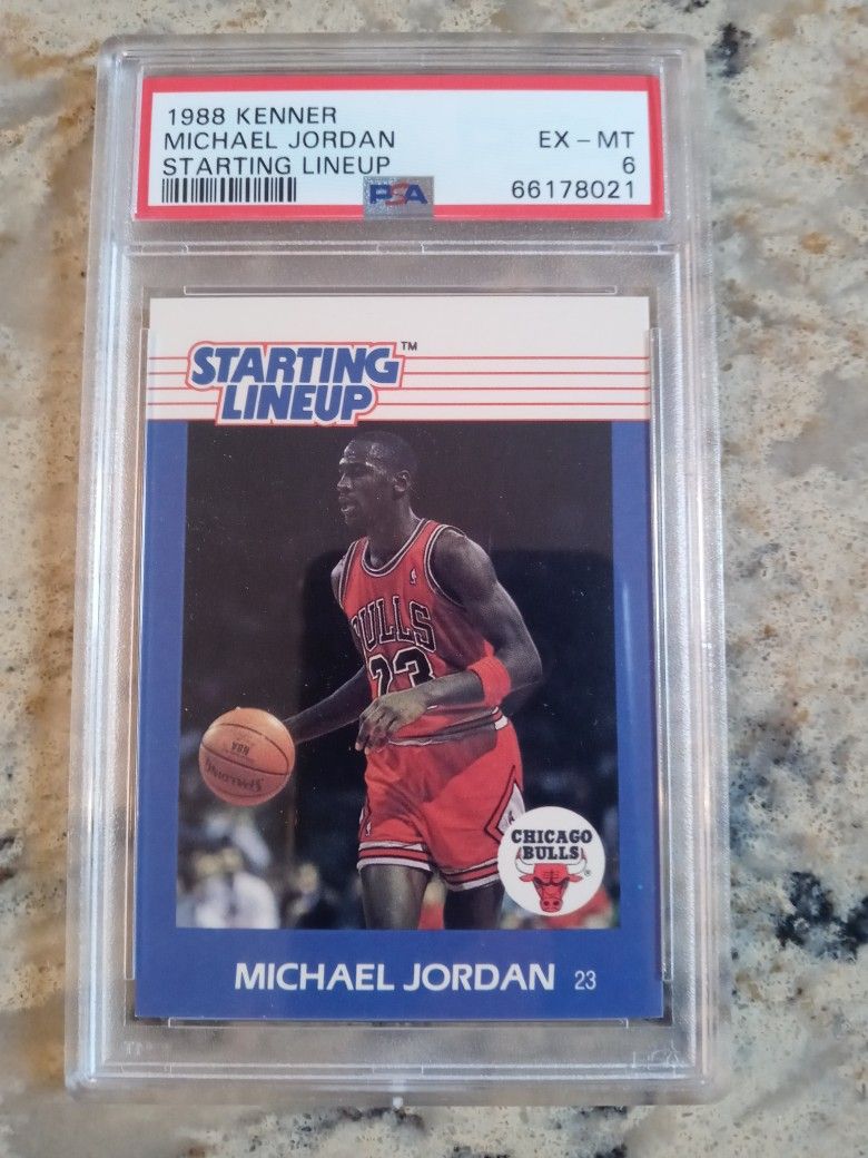 A 1988 Kenner Michael Jordan basketball card w/figure! Card is graded an EX-MT 6 by PSA!