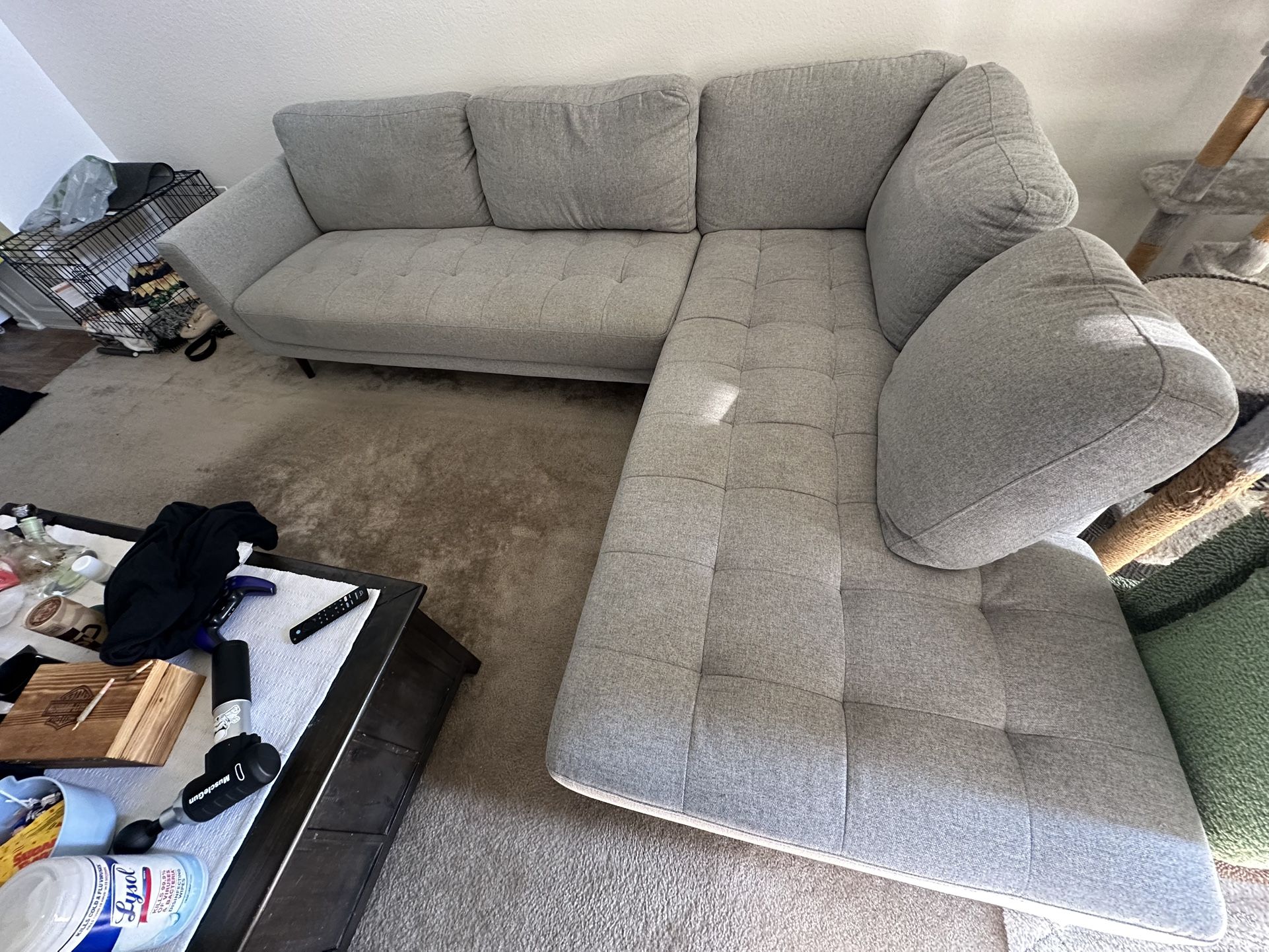 Beautiful L shape couch hate to sale it but moving to new space & can’t take it with me. I bought this in living spaces early last year, minor scruffs on lower part as pictures in close up picture. Created will moving here, otherwise in like new condition I have always kept a sofa cover to preserve it, bought new for $2300 as asking for $900obo thank you.