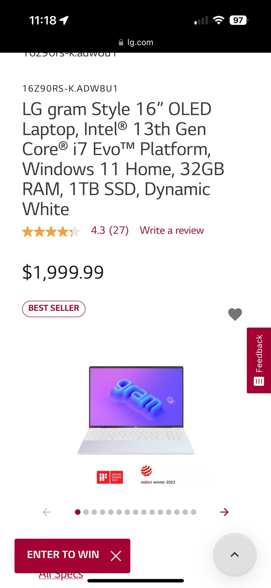LG gram Style 16” OLED Laptop, Intel® 13th Gen Core® i7 Evo™ Platform, Windows 11 Home, 32GB RAM, 1TB SSD, Dynamic White