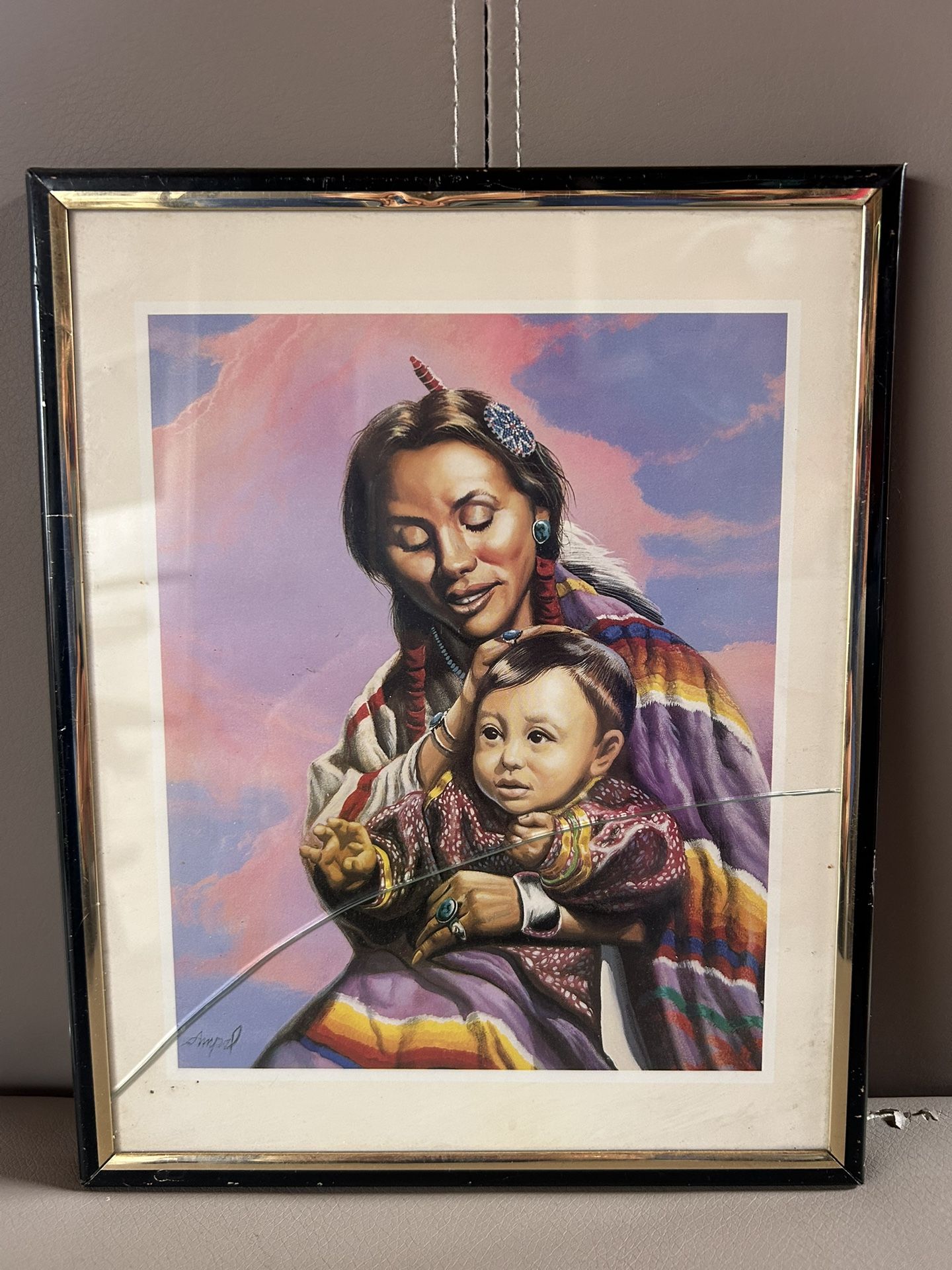 Native American Mother Child Framed Painting Art with Traditional Attire