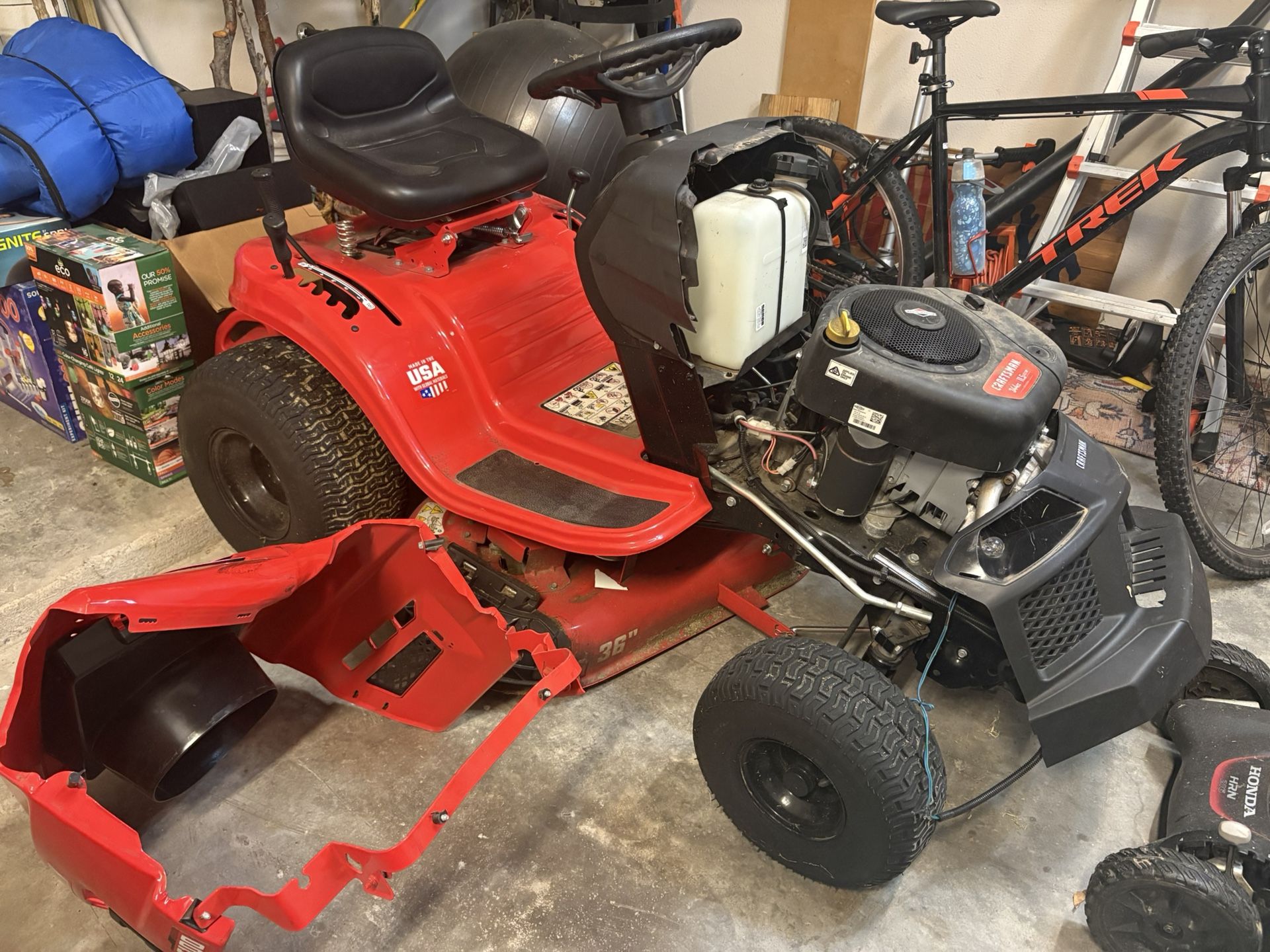 Less than 1 year old Craftsman T100 Riding Mower. I had an accident pulling a trailer hauling this mower. The mower hit the front of the trailer and bent the front hood and frame. The mower does crank but doesn’t turn over. Selling for parts or to repair.