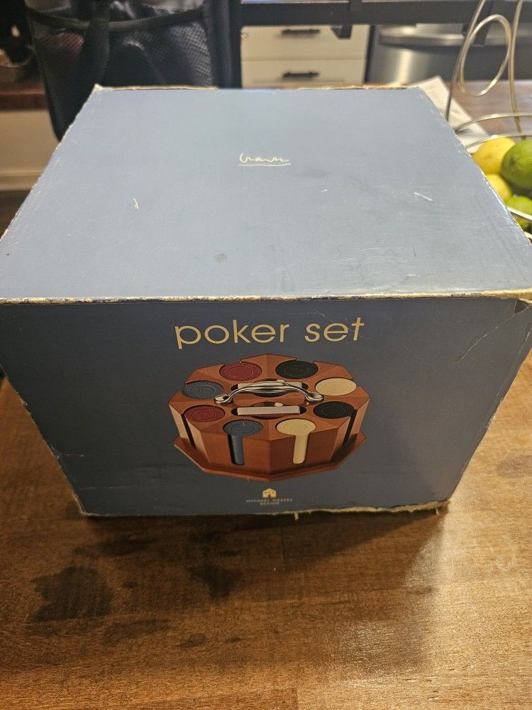 Everything is held by Cherry Wood finish holder 240 total poker chips of 4 different colors 2 Decks of cards with sleeve holders included store in their own slots Never used - Brand New Asking $50 obo