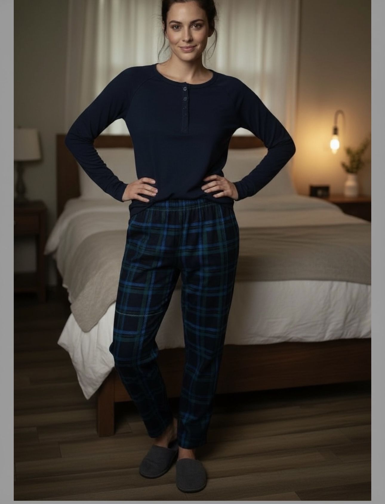 Featuring a navy long-sleeve henley top and coordinating plaid drawstring pants. The set is made of a soft material blend that often includes polyester, spandex, and rayon for a comfortable and soft feel. ® Product Details • Brand: Stars Above • Style Name: Cecy Pajama Set • Material: A soft blend, often polyester, spandex, and rayon Top: 65% Polyester, 35% Rayon Pant: 95% Polyester, 5% Spandex • Features: Includes a long-sleeve henley top with a button placket and matching drawstring pants Care Machine wash cold with like colors. Gentle cycle. Only non-chlorine bleach if necded. Tumble dry low. Remove promptly. Cool iron if needed.