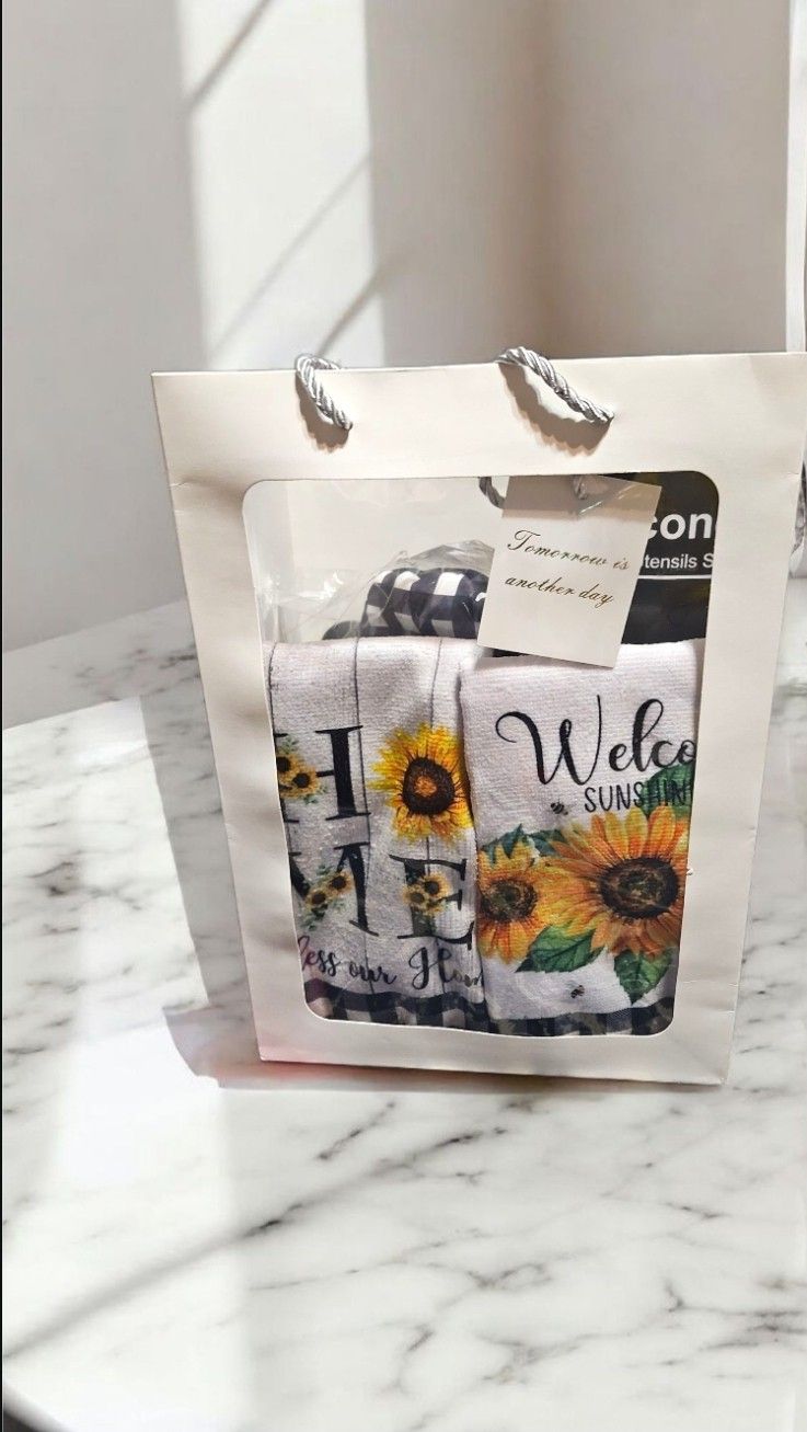 Sunflower 🌻 Kitchen gift set. Everything included is pictured. 11 piece silicone kitchen utensils set, 2 oven mits, a wash rag, 2 decorated kitchen hand towels, and a rest for utensils. New. Mustang/yukon pick up.