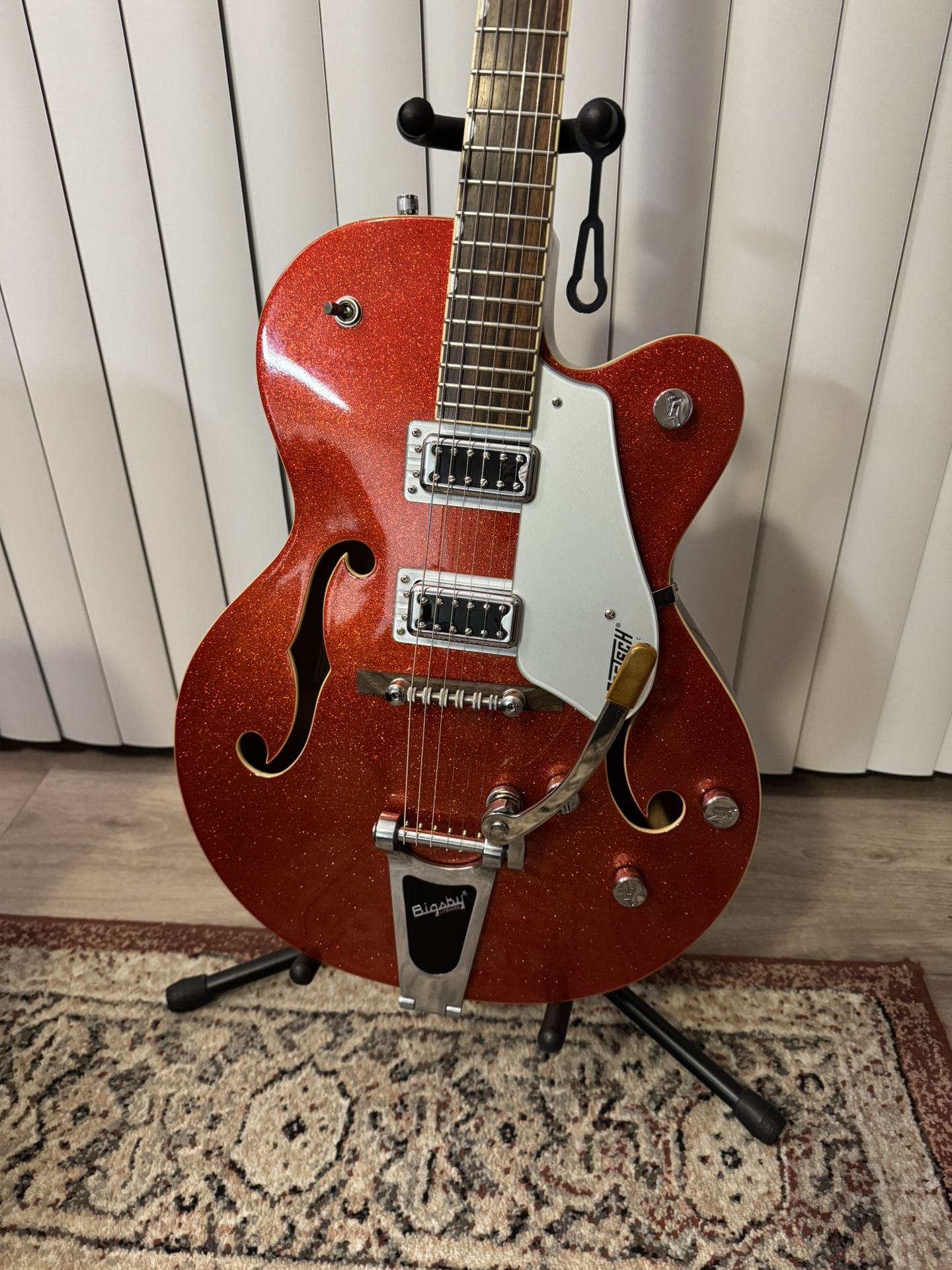 Perfect condition Gretsch G5420T in a rare sparkle red finish. This is set up with fresh strings, a condition fretboard, intonated, and very low action. This one is ready to play as is! Includes the hard shell Gretsch case. Not sure I want to let this one go but for the right price, I can. Might consider trades for other guitars, let me know what you have.