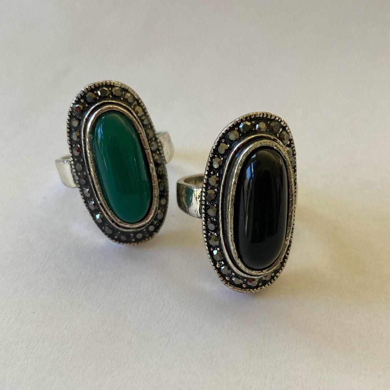 The silver-plated ring is inlaid with dark green and brown emerald. The ring is surrounded by black gemstones. Antique design