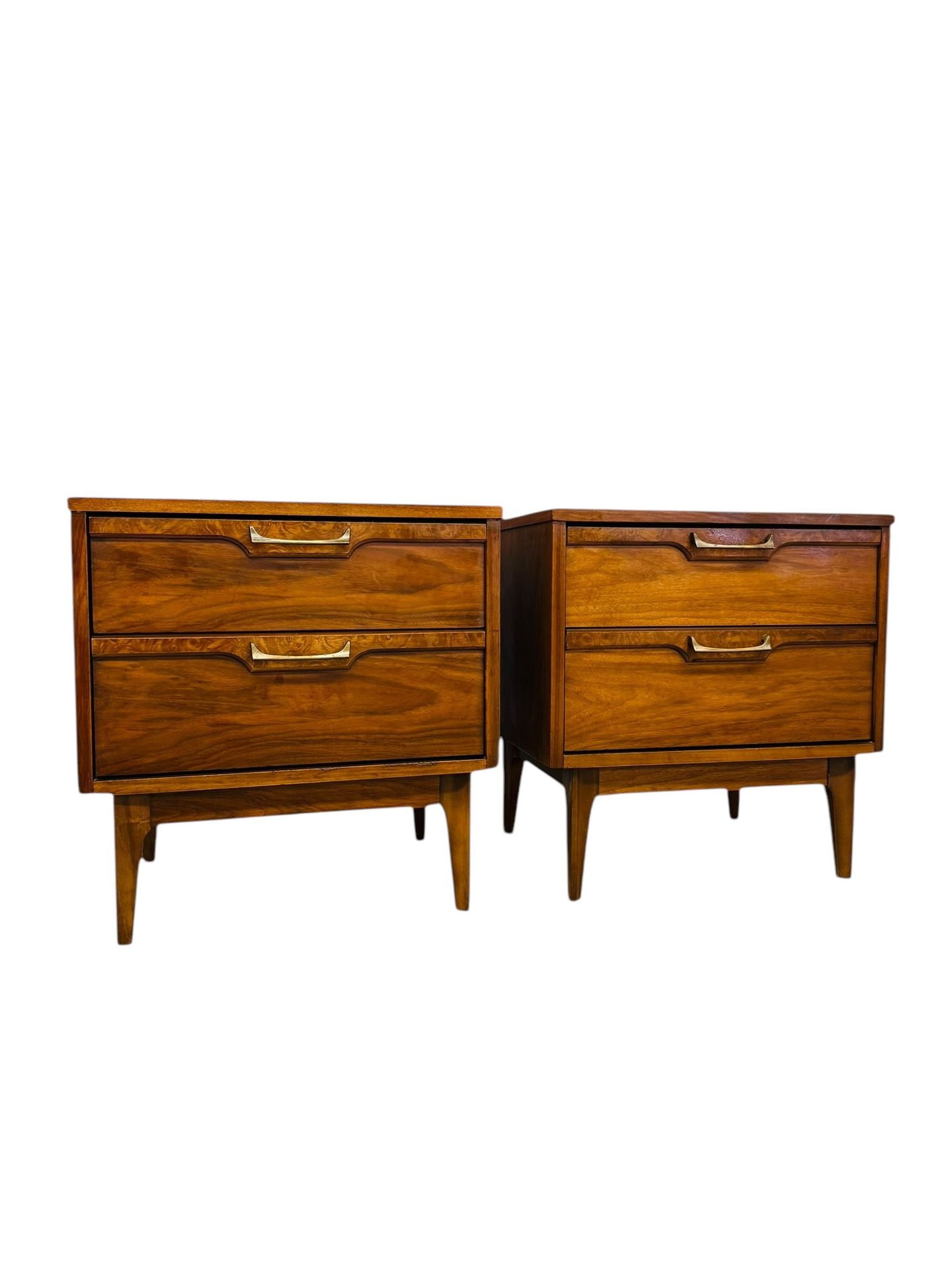 Vintage Mid Century Modern 2-Drawer End Table Set with Burl Accents Dovetailed Drawers
