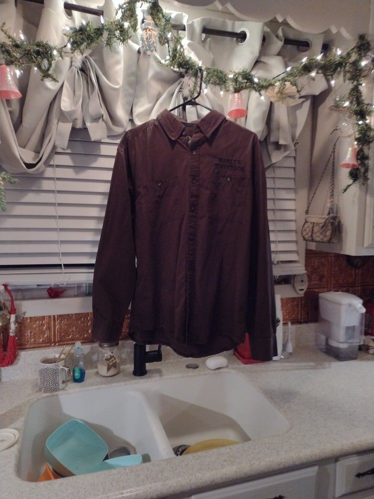 Harley men's dress shirt. Color is brown with black lettering. Size L Only wore 2 times