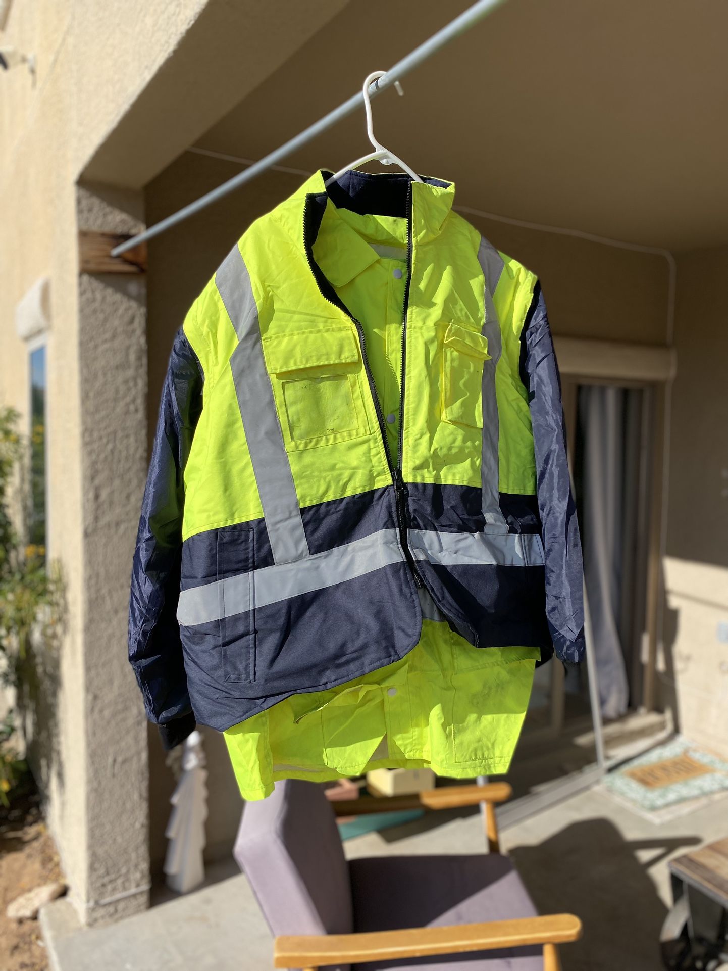 I'm selling a versatile work jacket that's perfect for various heavy-duty industries. This modular jacket features detachable sleeves and a quilted internal lining, making it adaptable to changing weather conditions. Additionally, the jacket's interior doubles as a rain jacket with pants, providing all-around protection. The standout feature of this jacket is its reflective design, making it ideal for situations where visibility is crucial, whether you work in construction, security, or any other field that demands high visibility. Construction Road Work Emergency Services Security Transportation Utility and Linemen Search and Rescue Manufacturing Event Staff Outdoor Activities Traffic Control Municipal Workers