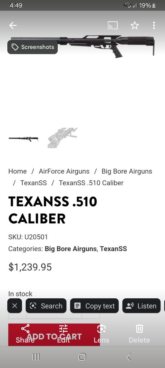 I have an Air Force Big Texan S.S .457 cal Air Rifle! It sells for 1300.00 new I am missing the Air tank! Will let it go for 600.00$ o.b.o I will send more pictures if you want