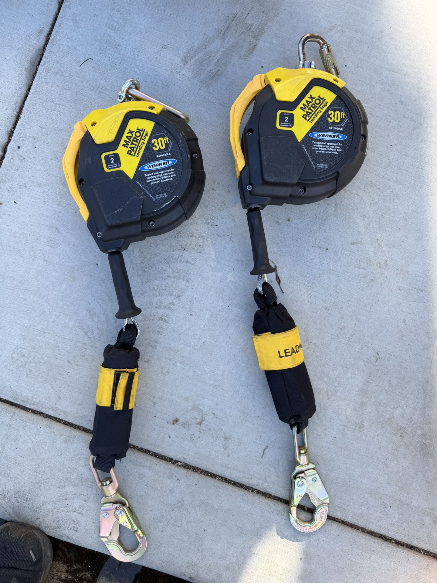 I have two available. $300 each or both for $550 30 ft Leading Edge rated SRLs — tested/approved for use over steel beam, B-Deck, and precast concrete. Heavy-duty fall protection units with shock pack and swivel snap hook. • 30 ft cable SRL • Leading Edge rated • Class 2 • Werner Max Patrol series Both are in great working condition and new. See photos. Only out of the box for demo purposes. Buy one or both. Pickup only. Cash or Venmo preferred.
