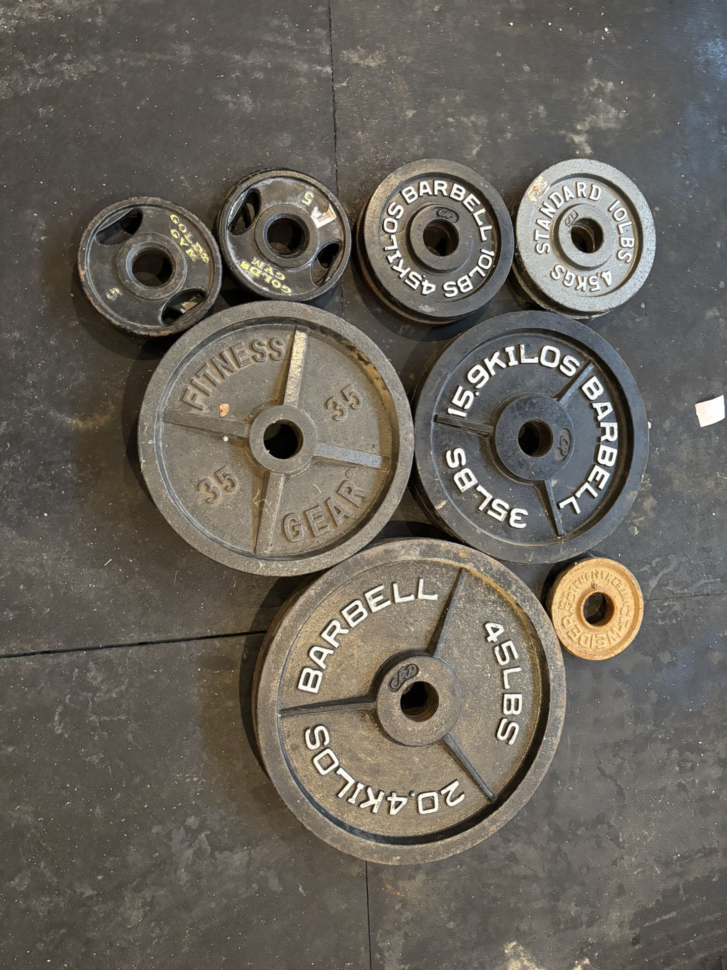 Assorted brands of cast iron plates that includes two 2.5lbs plates, four 5lbs plates, four 10lbs plates, four 35lbs plates, and two 45lbs plates for a total of 295lbs.