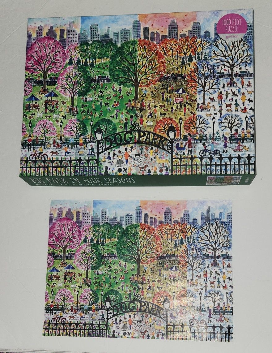 Here is a 1000 piece jigsaw puzzle by Galison called Dog Park In Four Seasons. It is complete. I am selling lots of puzzles (including lots of other items). Be sure to check them out! I live in Vista Del Lago Community on 192W. For pickup, use 14465 Vista Del Lago Blvd, Winter Garden for location to see where I am located. CASH ONLY.