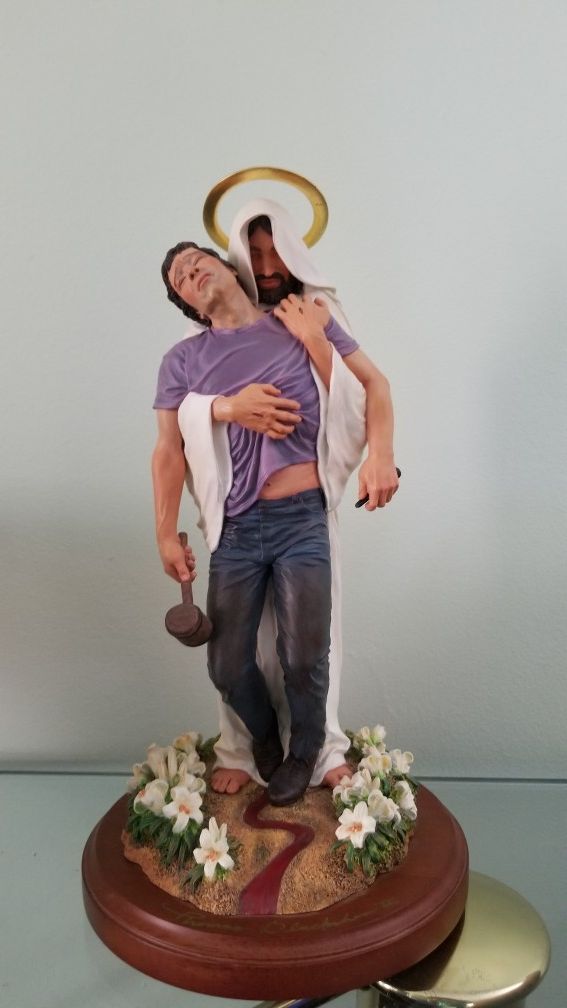 Forgiven Sculpture Limited Edition First Issue #1848 of 3500. Complete with the Certificate of Authenticity, Illustrated Book and Original Packaging. Original design with halo created by Thomas Blackshear. 12" Tall & 4.2 lbs. The scene of "Forgiven" is Mt. Calvary. A despairing man has a mallet in one hand and a large spike in the other. Both symbolize that each of us is responsible for Christ's death on the cross. Jesus Christ is holding up this broken man; at Christ's feet are broken chains, representing the sin that was overcome at Calvary. There is a trace of blood on Christ's hands, and in the place where the blood has fallen, lilies have grown. Thomas Blackshear uses powerful symbols in every detail of "Forgiven" - from the healing strength of the large hands of Christ, to the lilies representing His resurrection and the new life that is ours when we accept Him.