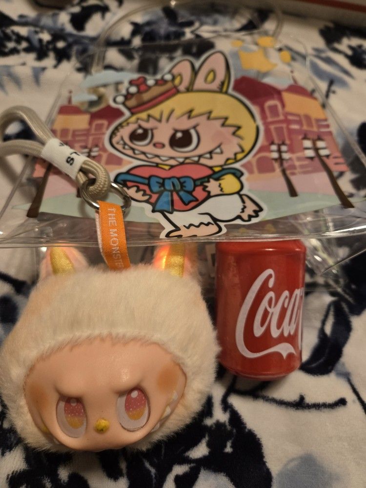 Singing labubu head Keychain, blind coke box(keychain), and labubu bag
