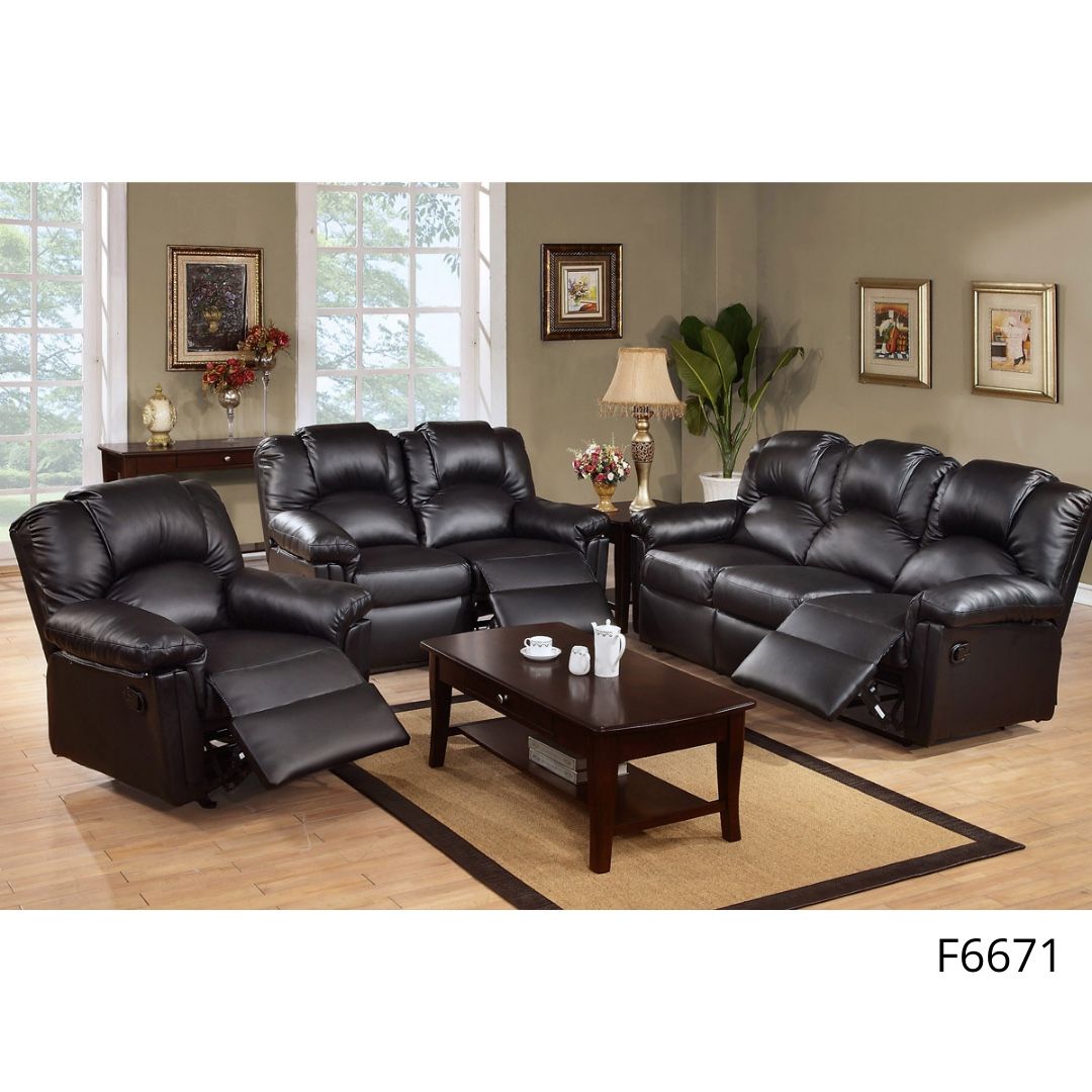 Sofa, Love Seat & Recliner Chair Item # F6671 Love Seat Item # F6672 Sofa Item # F6673 Recliner Color: Black Materials: Bonded Leather Hardwood Metal Some Assembly Required Dimensions: Loveseat: 60″ x 38″ x 40″H Sofa: 82″ x 38″ x 40″H Recliner: 38″ x 38″ x 40″H