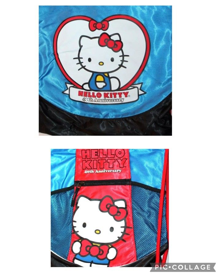 This Sanrio Hello Kitty drawstring bag is perfect for any young sports enthusiast or Hello Kitty fan. The 40th anniversary design adds a special touch to this sack pack, which measures 14" x 17" and is made of 100% polyester. The vibrant multi-color design is eye-catching and sure to stand out in any crowd. With a convenient drawstring closure, this bag is perfect for carrying clothing, shoes, or any other essentials for sports practice or games. The Hello Kitty character and theme make this bag a fun and unique choice for any child. Made in China and brand new with tags, this Sanrio Hello Kitty drawstring bag is a must-have for any young sports fan or Hello Kitty collector. Double image each side.