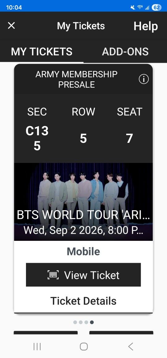 Bts ticket sofi stadium 1 ticket bought one extra seat is clear view lower bowl to view the whole show 5 row can see the bts members on the cart. Super hard to get. Just bought an extra can meet in person for the transfer
