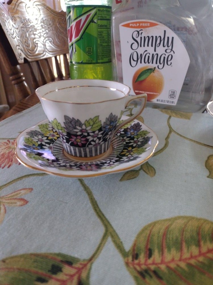 Rosina Fine Bone China Teacup, Made in England, Stoke on Trent, 1950's, Unusual Design with Bright Flowers and Black and White Background.