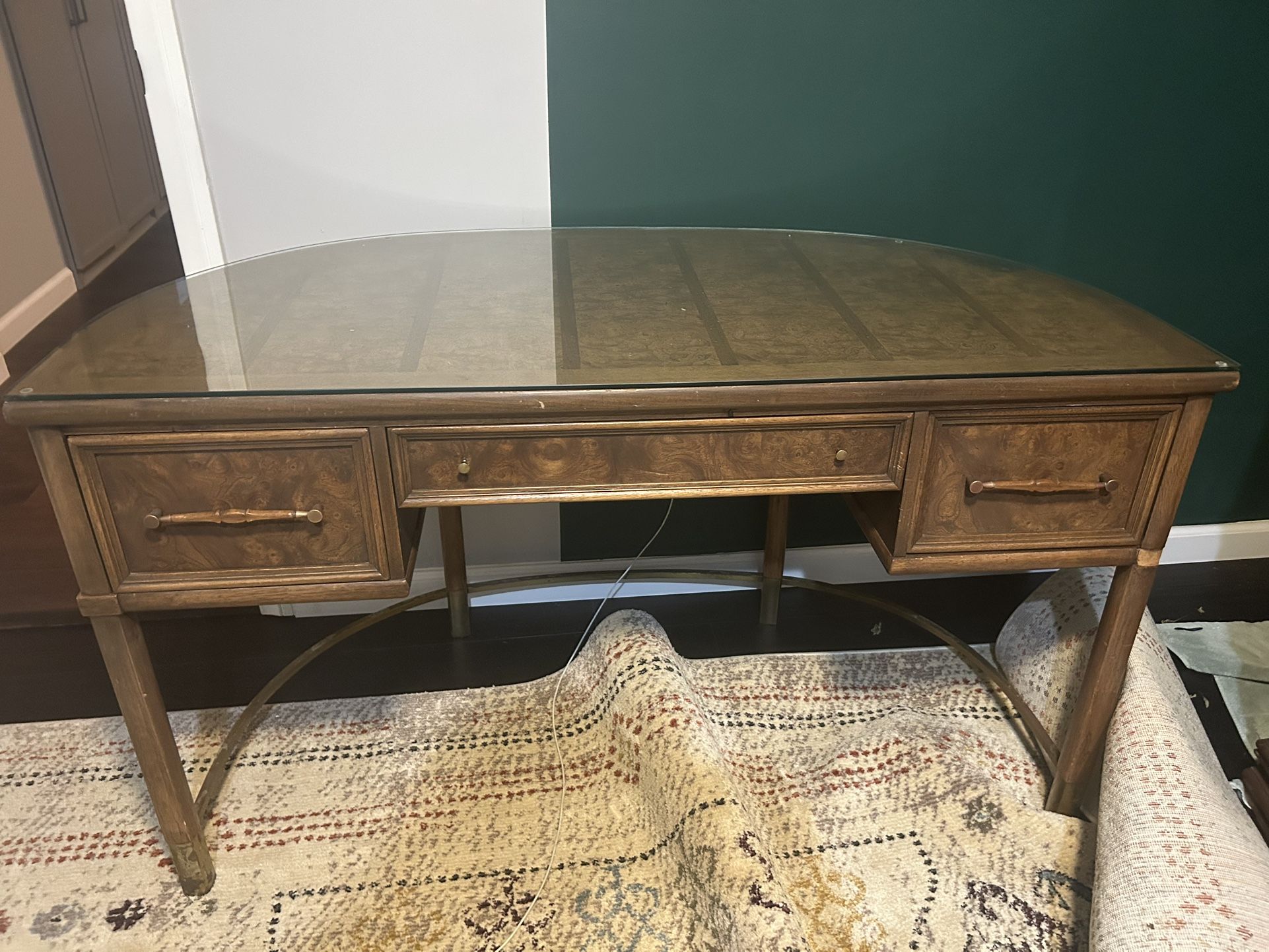 Midcentury desk with a couple of pieces missing. Glass top. 29.5” h x 24” w x 493/4” l