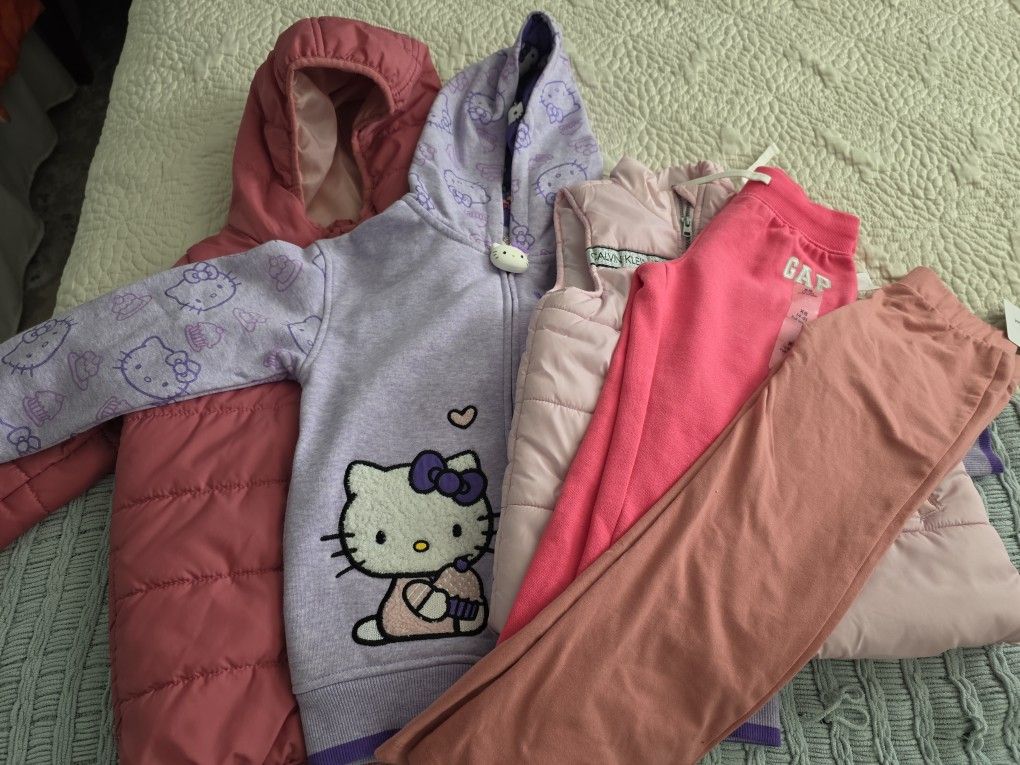 Warm girl clothes in either new with tags or great condition. All for $20 Vest- size 5 Pink jacket- size 6 Hello kitty sweater -size 6 GAP sweatpants- size 4-5 Nike jogger size 6