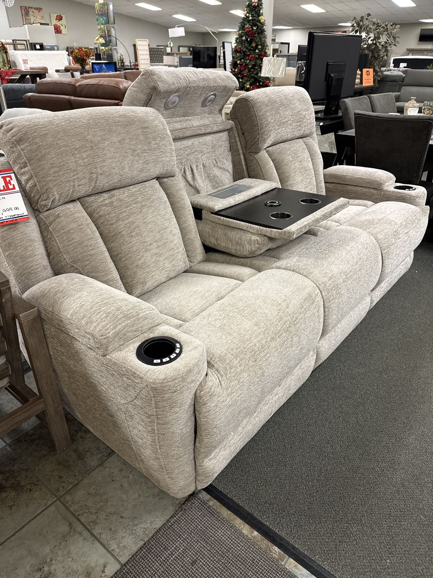 The ultimate entertainment power sofa in fabric . This sofa is fully loaded with power recliner, power headrest, drop down center console, wireless charger, and power strip . This sofa is super comfortable, so make sure to stop by and experience it yourself. This sofa can be paired with a single recliner chair or love seat. It can also be ordered as a sectional . Visit our showroom Treasure Hunt Furniture located at 1129 South Main St in Salinas,ca