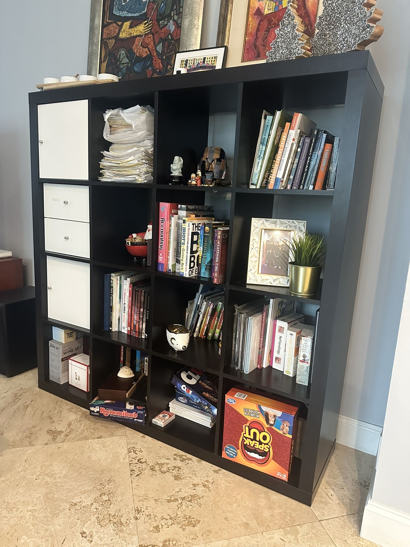 Modern black cube storage shelf in excellent condition, measuring 59 inches tall, 59 inches wide, and 16.5 inches deep. Includes removable white doors and drawers that can be installed in any cube you prefer, allowing you to customize the layout to fit your space. Sturdy, clean, and perfect for books, decor, office supplies, or kids’ items. Ideal for an office, living room, or playroom. Easy pickup in Boca Raton.