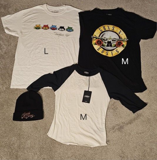 All new never worn The white & black tee is a Harley Davidson brand new with tags The cat shirt is from a brand twenty-six red The beanie is cheech & chong $5 each or $15 for all