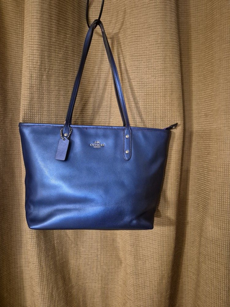 The Coach Large Leather Tote Bag is a stylish and spacious accessory for women, perfect for carrying everyday essentials. Made from pebbled leather with a solid blue exterior color and a vibrant purple interior lining. This rectangular tote features silver hardware accents and double leather handles. With inner pockets for organization and a zipper closure, this designer bag also includes a charming accessory and is part of the Coach Outlet product line. The tote is a versatile statement piece that adds both sophistication and functionality to any outfit.