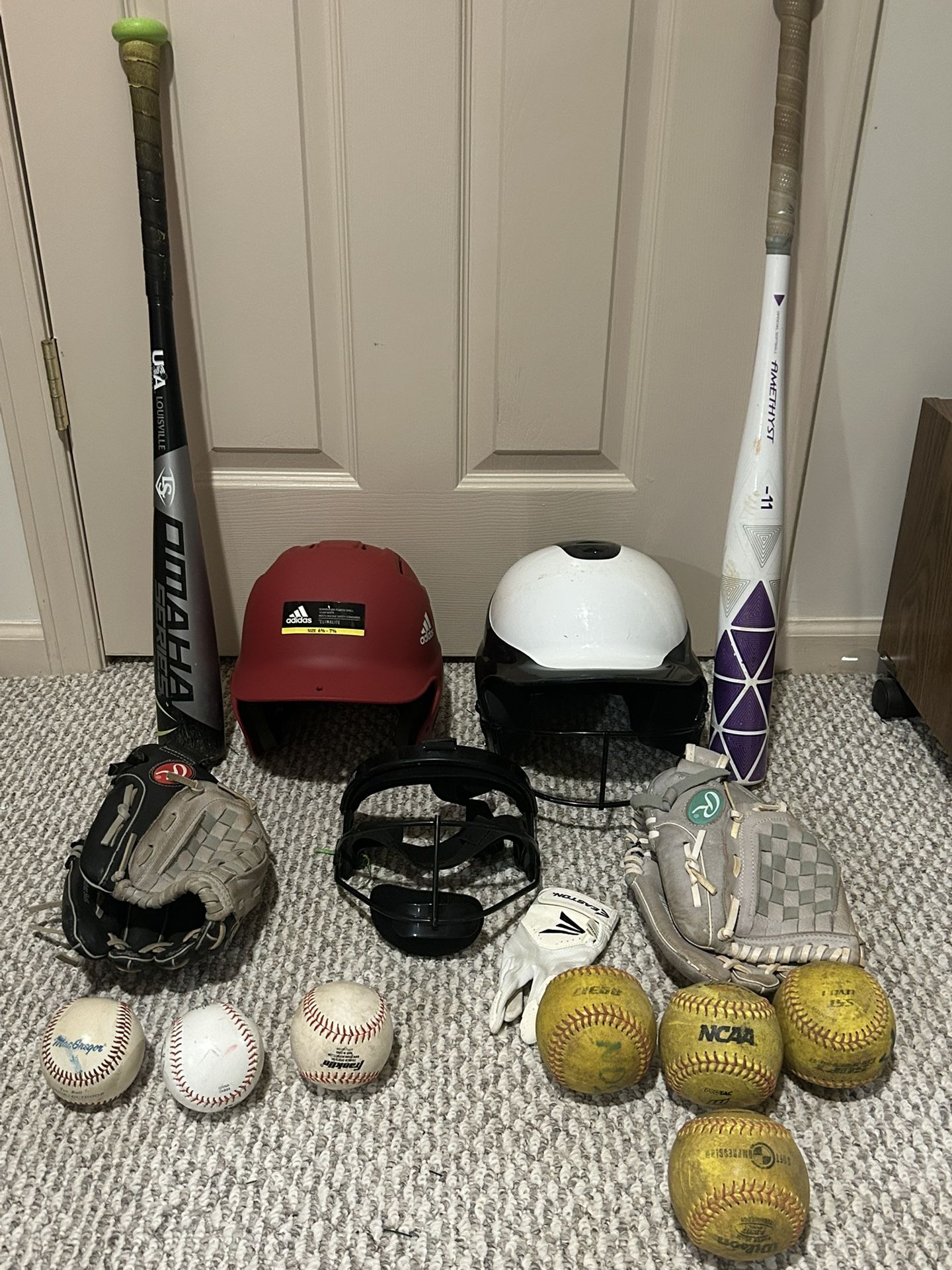 I’m willing to sell both baseball and softball group items for $150, or as separate baseball ($80) or softball ($100). ——————- Baseball ($80) -New/Never Used Red Adidas Helmet- size 6 3/8 to 7 3/8 -Rawlings glove all leather shell- size 11 1/2 inch (used 2 seasons) -Louisville Slugger Omaha Series bat-27 inch, 17 oz, 2 5/8 inch barrel (used 1 season) -Youth baseballs ——————- Softball ($100) -Helmet with mask by Rip It-size S/M 6- 6 7/8 (used 2 seasons) -Easton Amethyst softball bat; ISA and ASA approved, NSA, USSSA-29 inch, 18 oz, 2 1/4 diameter (used 2 seasons) -Mask when on the field (used 2 seasons) -Rawlings Softball glove all leather shell- size 11 1/2 (used 2 seasons) -4 youth softballs