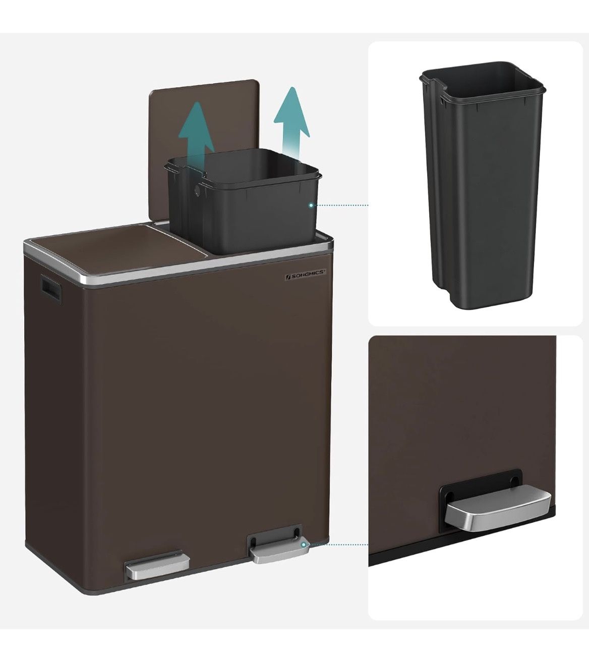 New in box Trash Can, 2 x 8 Gallon (2 x 30 L) Garbage Can for Kitchen, with 15 Trash Bags, 2 Compartments, Plastic Inner Buckets and Hinged Lids, Airtight, Brown ULTB60BR