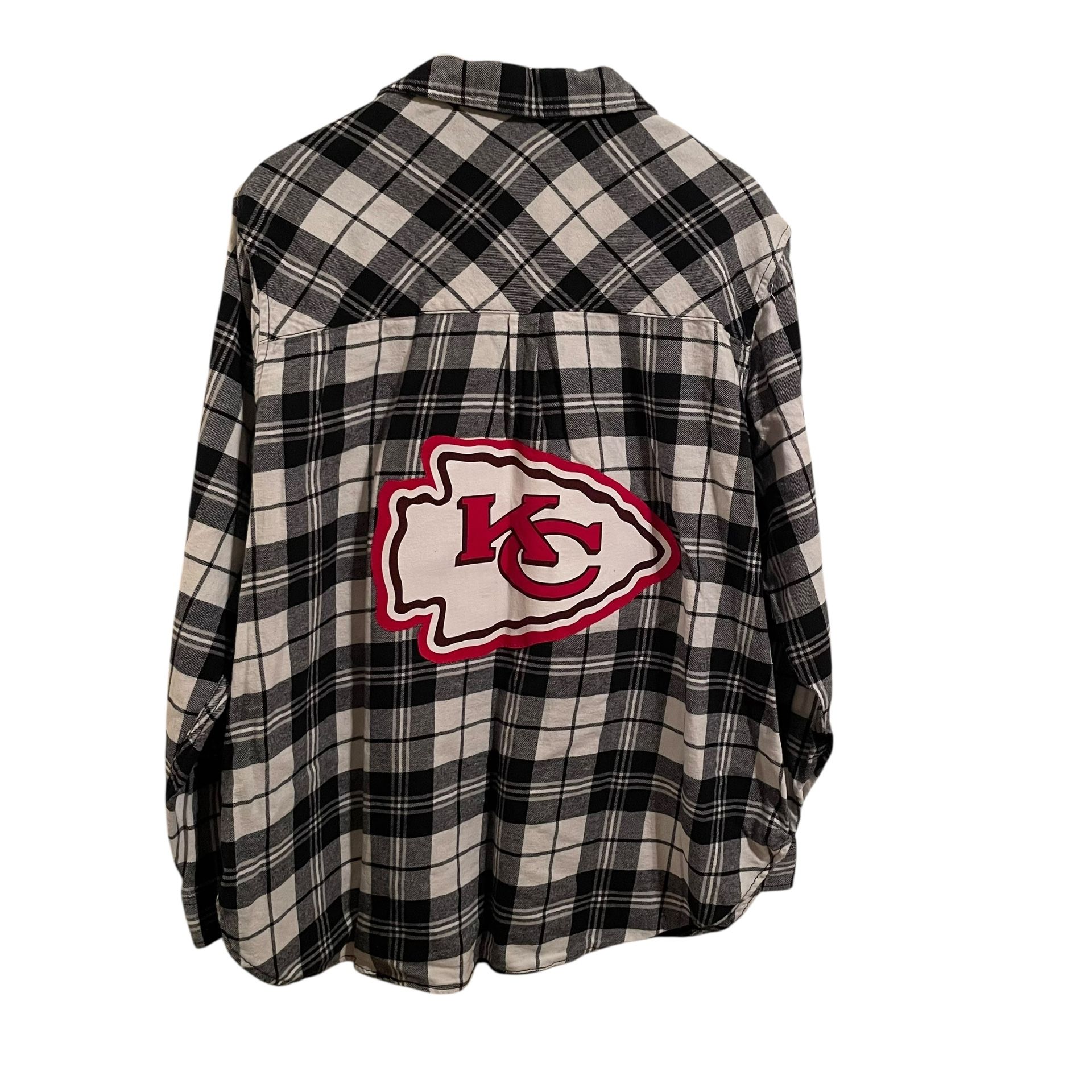 Upcycled Kansas City Chiefs Black and White Plaid Flannel Button Front Shirt XXL