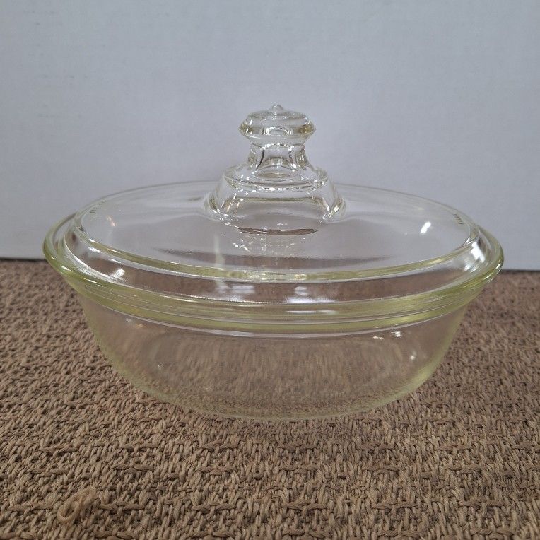 This is a vintage Pyrex oval covered casserole dish with a knob handle lid. The dish is made of clear glass and is an early piece of Pyrex dating back to the 1910s and 1920s. It features a distinctive knob on the lid and small handles on the dish. Pyrex glass is known for its durability and was a staple in kitchens for generations. Great condition. No chips. Porch pickup. (GH).