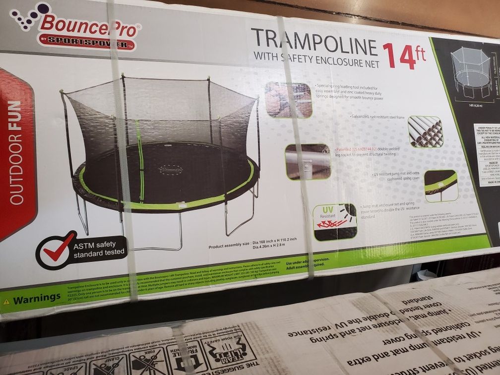 NEW 14 FEET TRAMPOLINE WITH EASY MOUNTING PROTECTIVE MESH, NEVER USED IN ITS SEALED BOX!