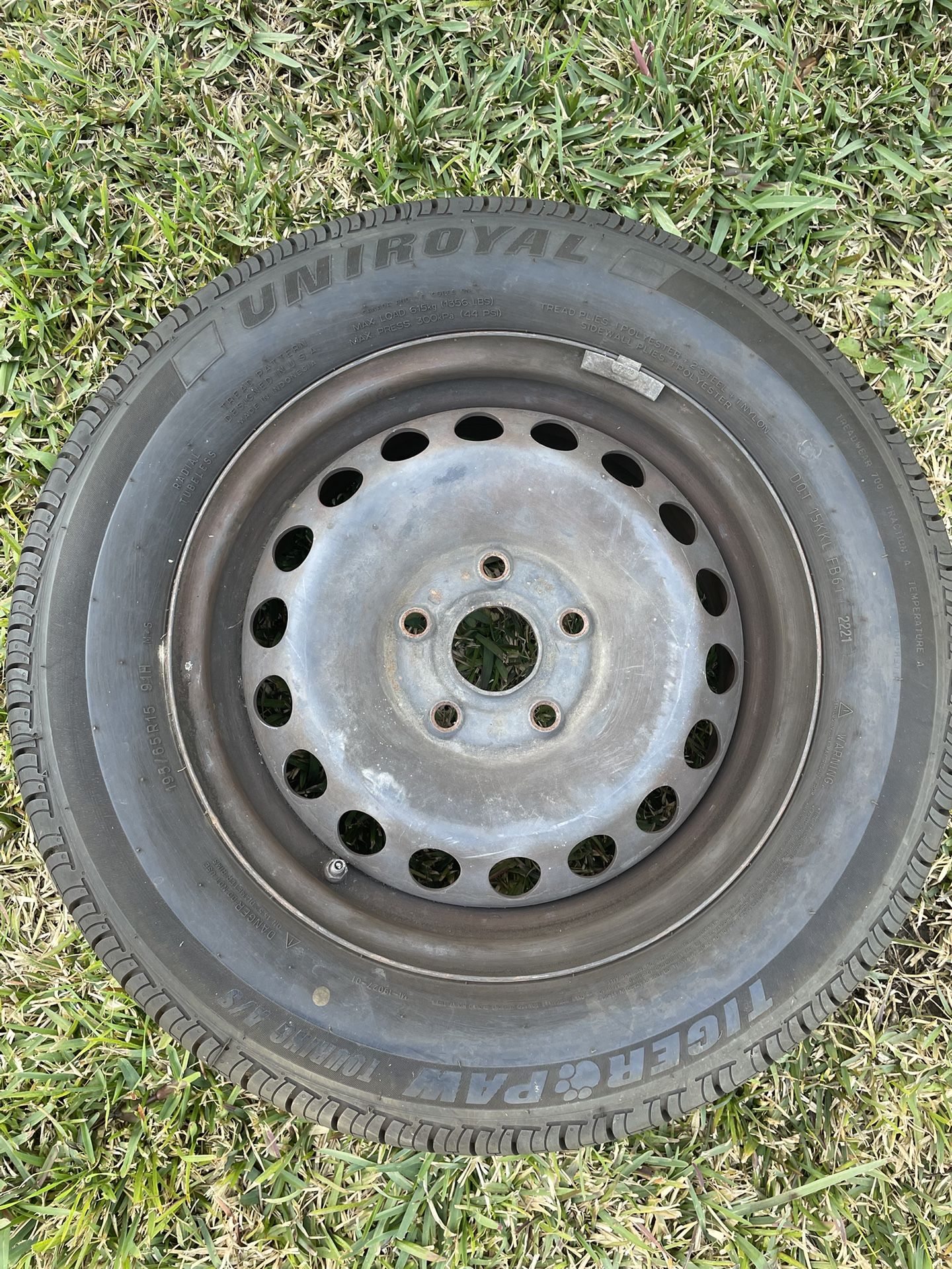 195/65/15 Uniroyal Tiger Paw, looks new. I don’t know what the rim fits but looks smaller than 5x114.3