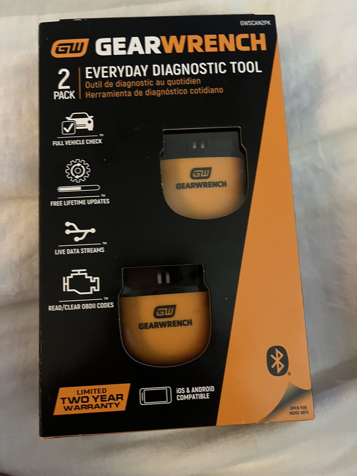New in box never opened Gear Wrench Everyday DiagnosticTool. 2 pack. IOS & Android Compatible. Full vehicle check, free lifetime updates, live data streams, read/clear obdII codes.
