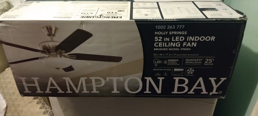 New still in the box ceiling fan and LED light. Hampton Bay fan with a brushed nickel finish. Delivery available