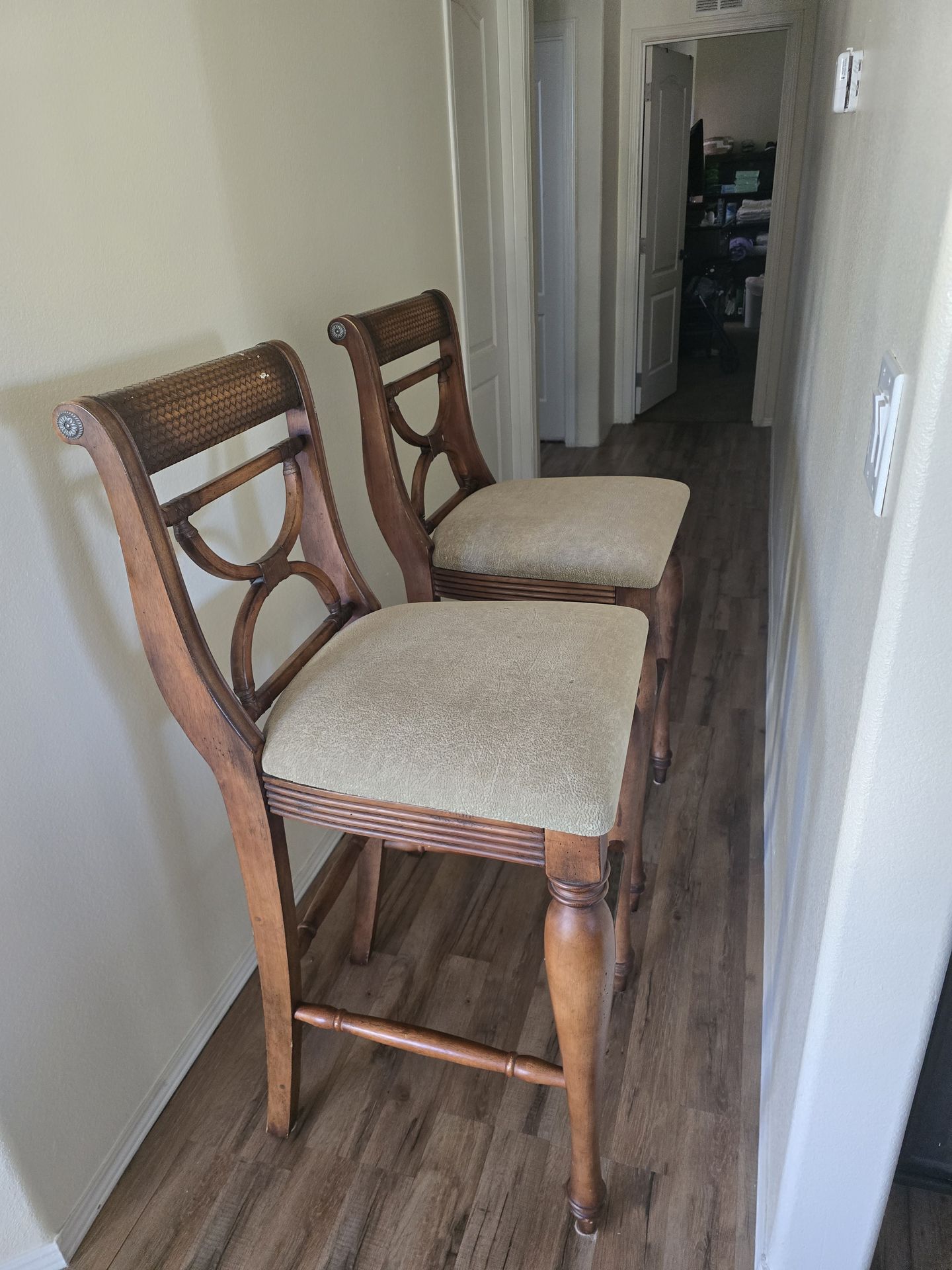 2 barstools; beautiful solid wood, very comfortable and heavy duty. They are clean and ready to go.