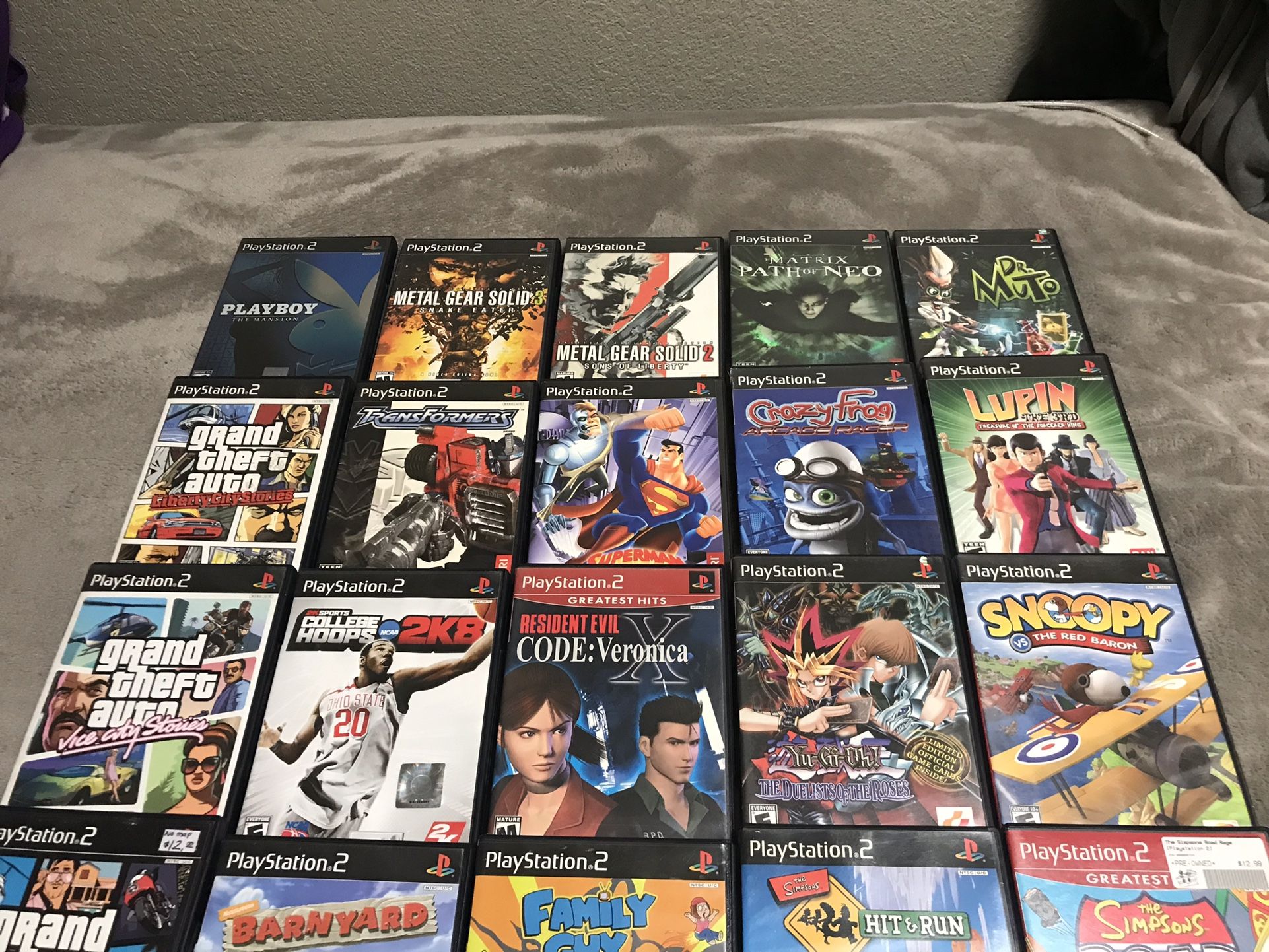 Metal Gear 2 $12 Metal Gear 3 Snake Eater $15 Matrix Path Of Neo $20 Dr Muto $12 Gta Liberty city stories $20 Gta Vice City stories $80 Gta vice city $10 Transformers $20 Superman $15 Crazy frog $12 Lupin the 3rd $30 No Manual College hoops 2k8 $20 Resident evil code veronica x $20 Yugioh $25 Snoopy $20 Barnyard $45 Family guy $35 Simpsons Hit & Run $75 Complete With Reg Card & Rare Trading Cards Simpsons road rage no manual $8 The sopranos $35 Street fighter ex3 $25 Marvel vs capcom 2 $80 Marvel nemesis $15 Aliens vs predator $30 No Manual
