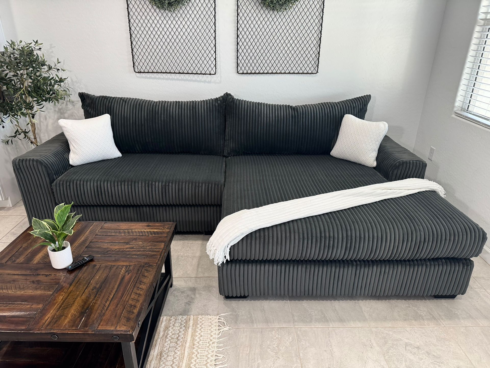 Excellent condition! It measures 10.5ft x 6ft. One of the most comfortable couches I have sat on! The chaise can go on either side. The pictures don’t do justice on how big this couch is! All the cushions have zippers if you ever need to wash them. Comes from a clean and smoke free home. I have a truck and can deliver if needed!
