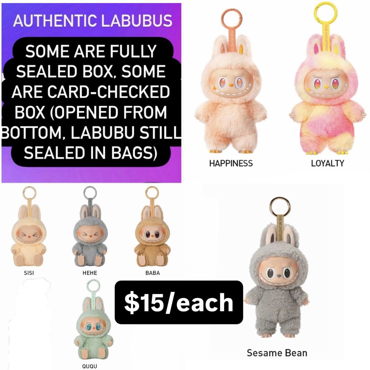 $15/each or $40/three HAVE A SEAT (card-checked box & some POPNOW sealed box): Sisi Hehe Ququ Baba BIG INTO ENERGY (card-checked box & some POPNOW sealed box): Happiness, Loyalty, Serenity EXCITING MACARON (card-checked box): Sesame Bean 100% authentic purchased from Pop Mart online. Card checked boxes = box only opened from bottom to check color cards. Plushes still sealed in bags. ——— PRICES ARE FIRM. Yes you can pickup today. Pickup in San Jose 95122 (near Eastridge Mall). Cash, Venmo, Zelle payment. Shipping also available (starts at $6)