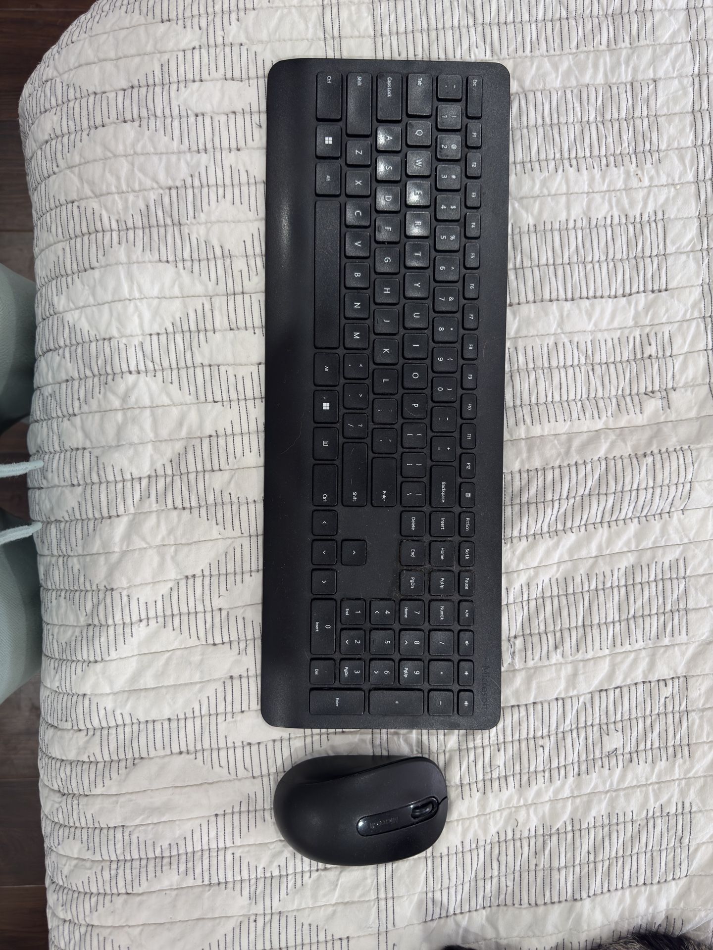 Used keyboard and mouse. Wireless. $5. Comes with usb to connect. Uses batteries.