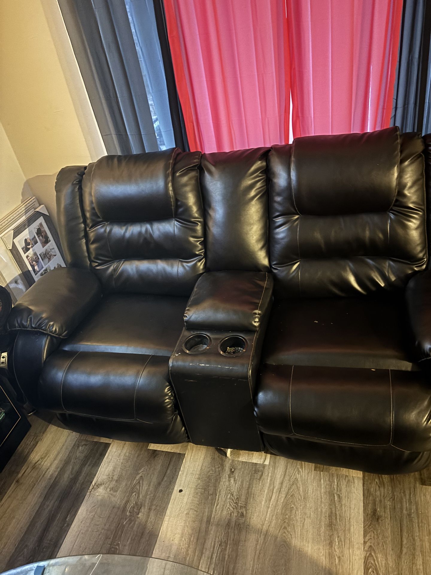 Two piece, black recliner, leather couch, and love seat with 2 small cuts on the couch and love seat at the bottom