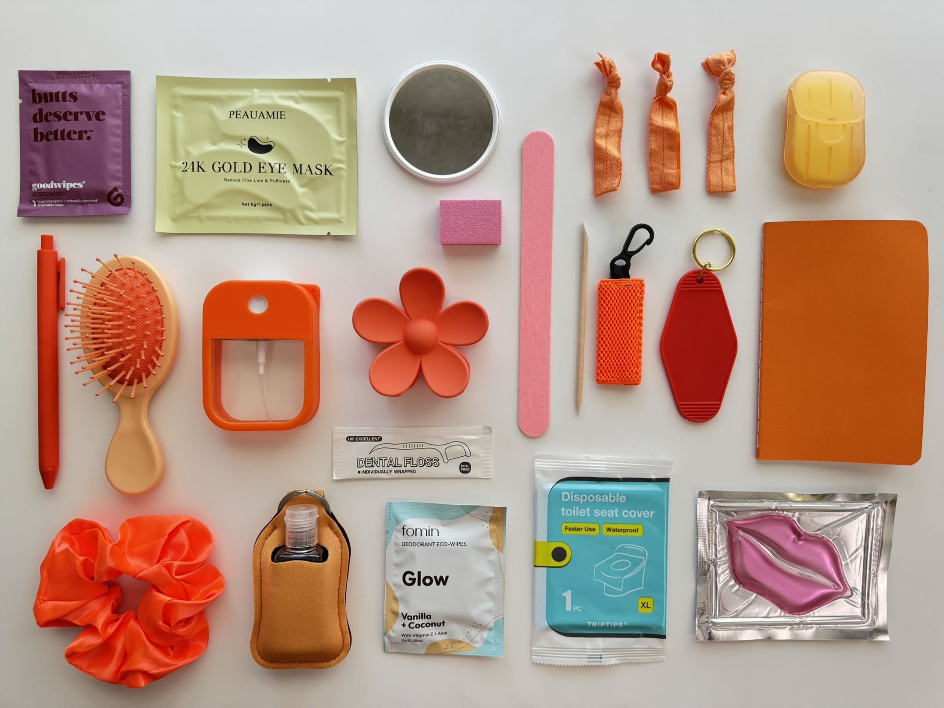 Each kit is color themed and comes with the following items: 2 flushable wipes 1 eye mask 1 mini mirror 1 pen 1 mini hairbrush 1 refillable hand sanitizer bottle 1 large flower clip 5 individually wrapped dental flossers 1 disposable manicure kit 1 chapstick holder keychain 1 vintage motel keychain 1 pocket notebook 3 hair ties 1 pack hand soap papers 1 scrunchie 1 refillable hand lotion bottle keychain 2 deodorant wipes 2 disposable toilet seat covers 1 lip mask Each kit comes in a plastic, zippered pouch for easy storage. Freebies included with each purchase. See additional image for sample of packaging.
