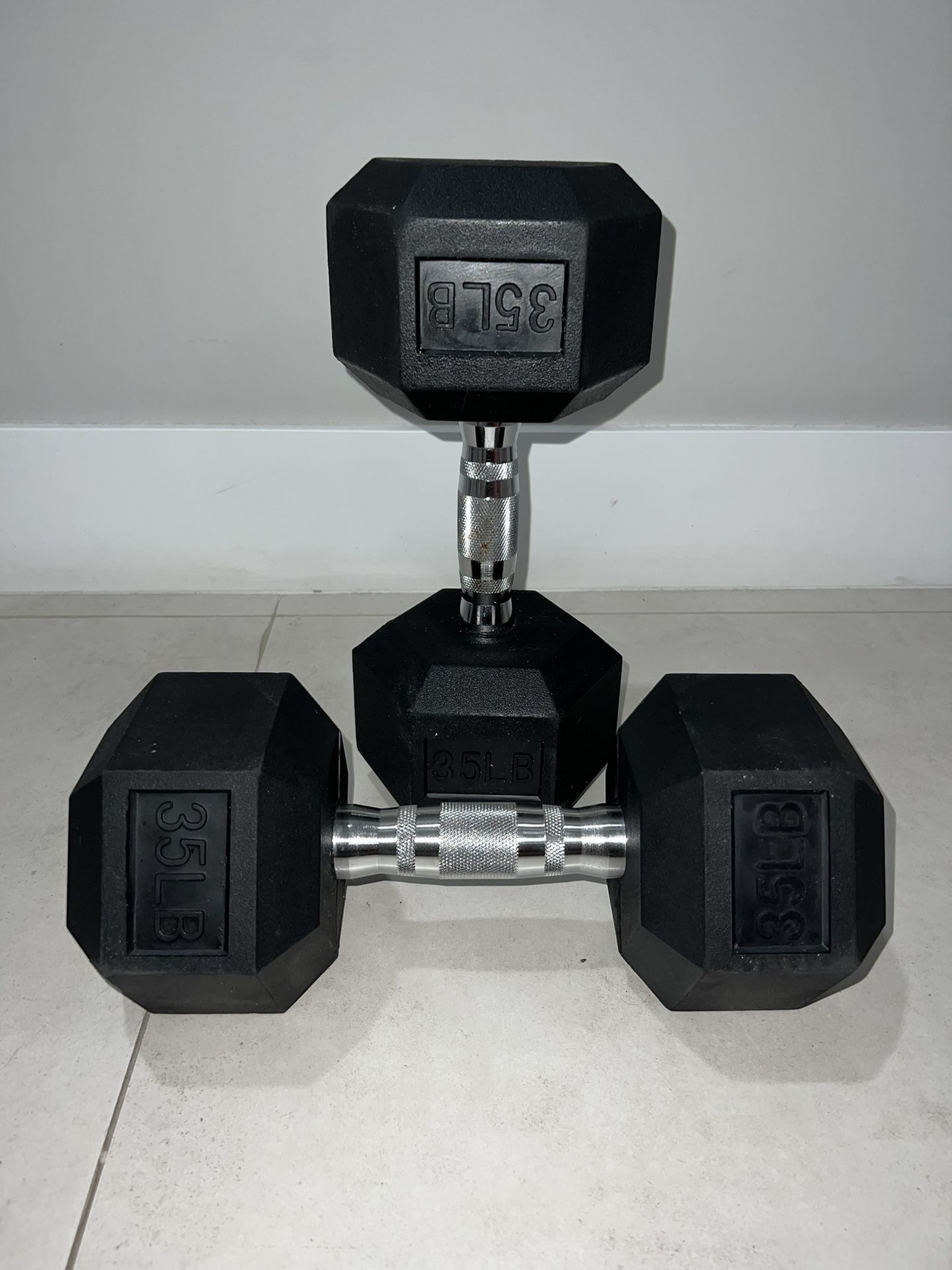 Like new dubbed hexagon dumbbells Availble today Total weight of 70 lbs Feel free to message me with questions Gym equipment dumbbells