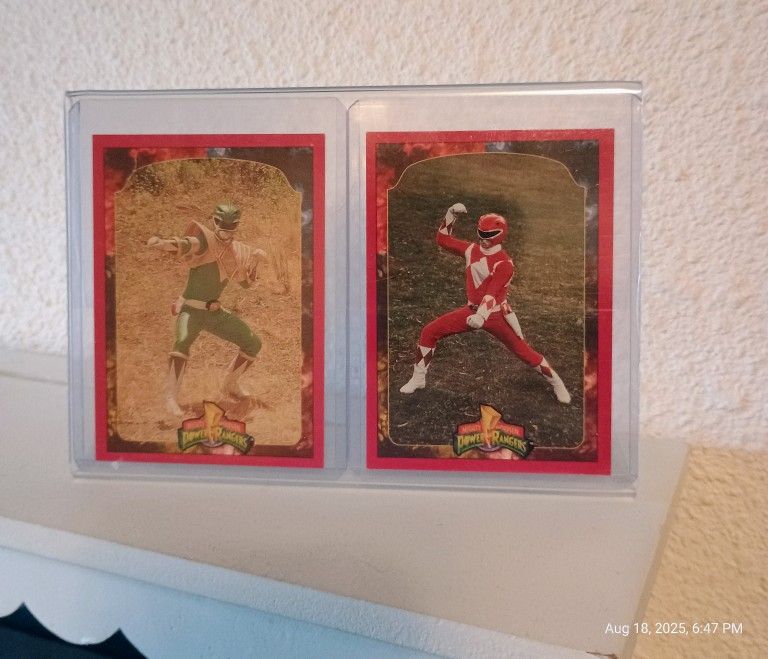 Two 1994 Power ranger cards in a 4x6 display. The Red ranger #117 & Green ranger #122. Both cards are in good condition that are out of the 1994 Mighty Morphin power ranger set. Both cards are in new top loaders that are in a new 4x6 display.
