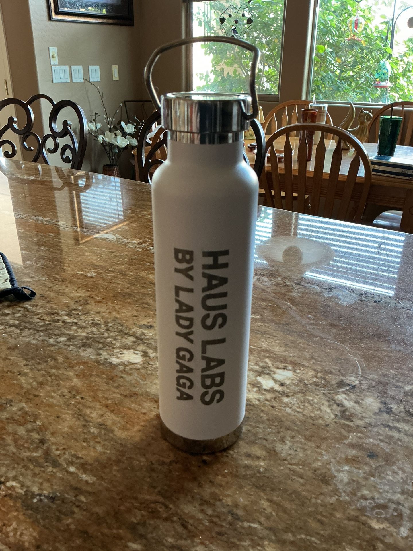 NWT limited edition, hard to find, Haus Labs by Lady Gaga insulated water bottle. White with silver-tone accents and a wire carrying handle. The bottle features copper vacuum insulation designed to keep drinks cold for up to 48 hours and hot for up to 12. Condensation proof.
